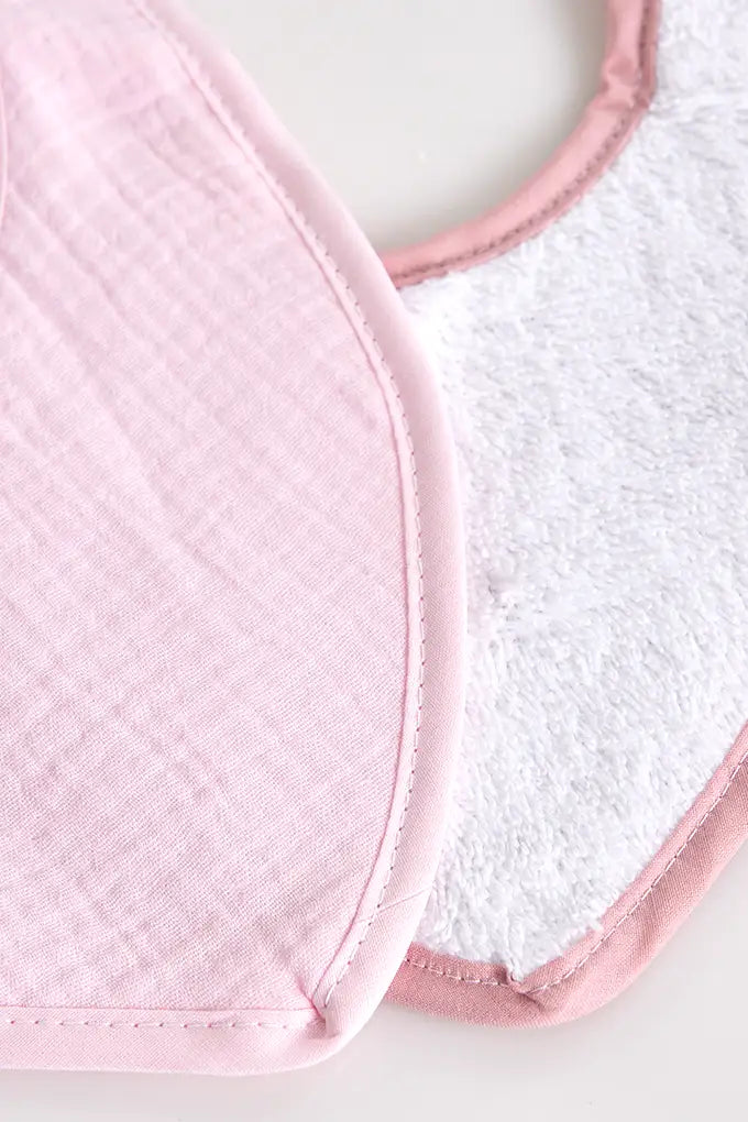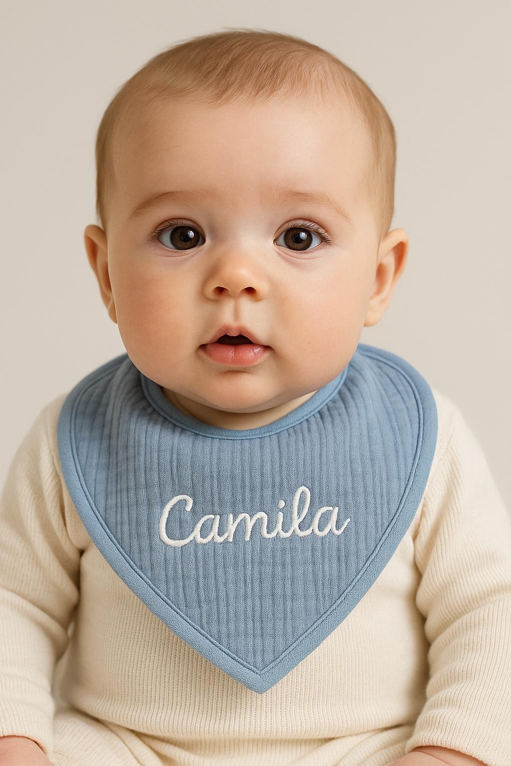 Babetes tipo bandana em tecido de musselina com forro em felpo. Fecha com molas de pressão.