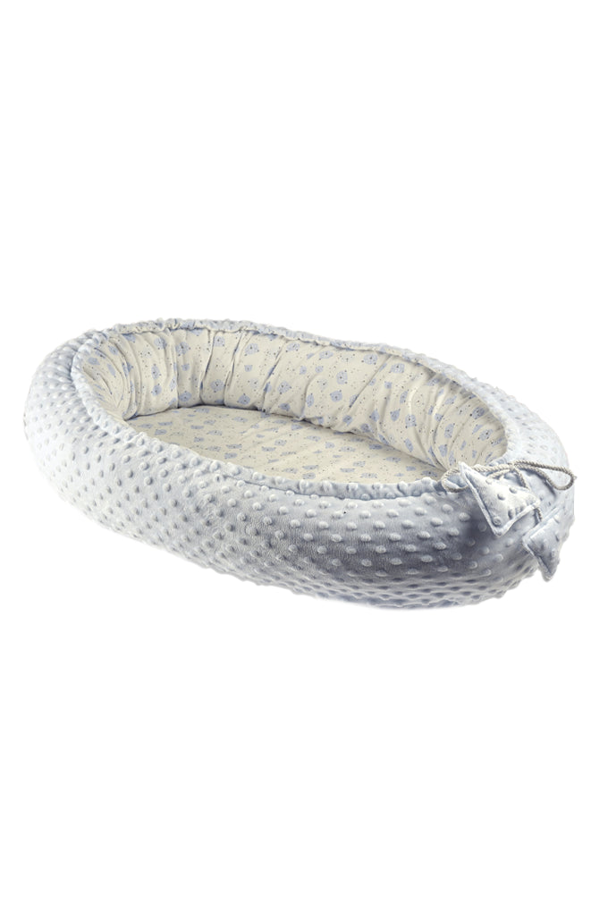 Ninho de bebé acolchoado com interior estampado e exterior em tecido de topitos. Modelo ajustável com laço para maior conforto e segurança. Ideal para momentos de descanso e sestas.