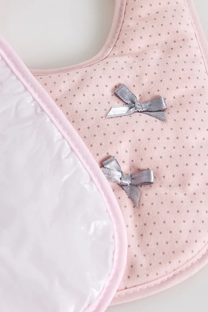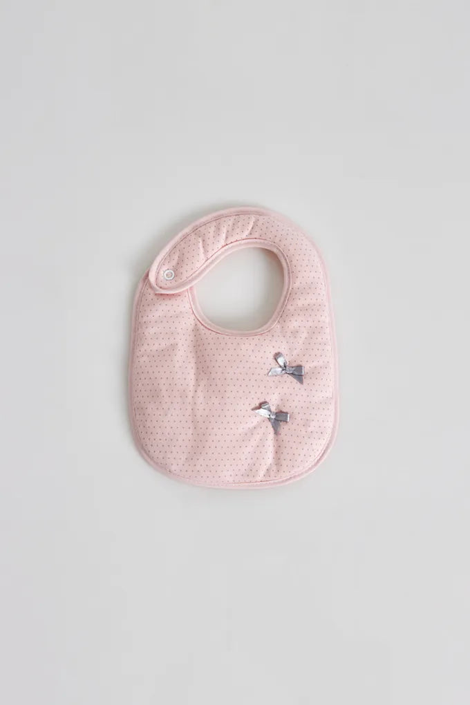 Babetes plastificadas, em tecido de algodão, com aplicações estampadas de pintas e um laçinho. Vies colorido.