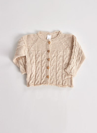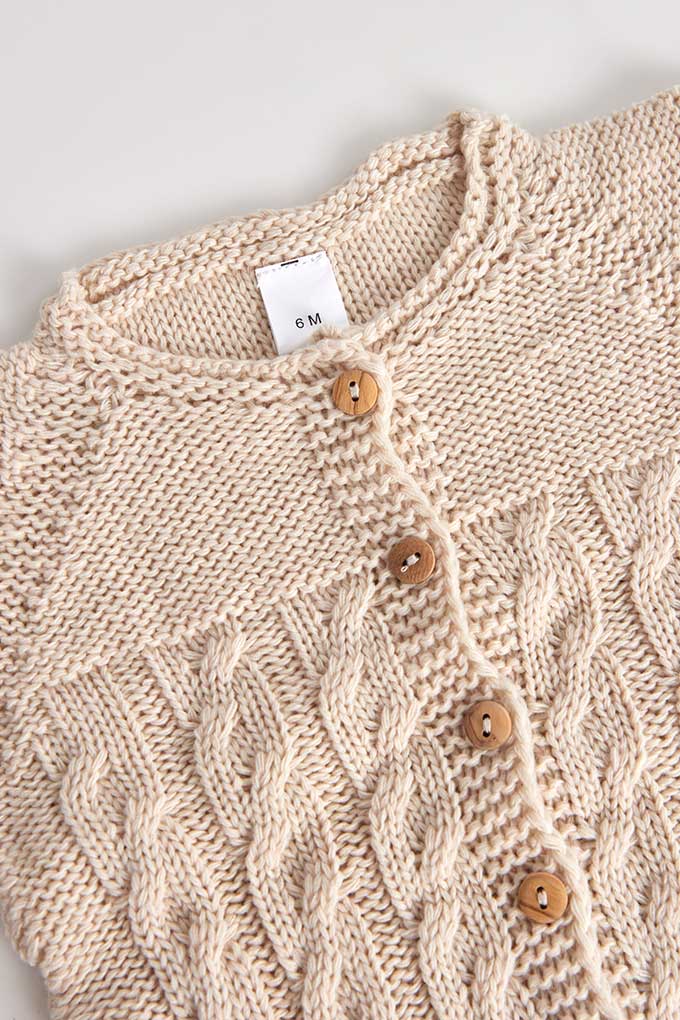 Casaco em malha suave, com padrão de trança delicado, pensado para envolver o bebé nos dias mais frescos. Com fecho de botões à frente, une conforto e praticidade, num estilo clássico e intemporal. Uma peça acolhedora para os primeiros passeios de outono e inverno.