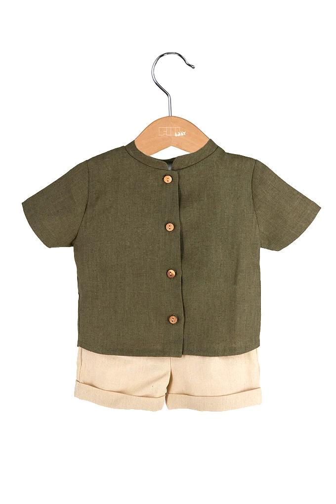 Conjunto de bebé em tecido de linho, composto por blusa de manga curta com botões frontais em madeira e calções em tom cru. Ideal para dias quentes, combina conforto e um estilo clássico.