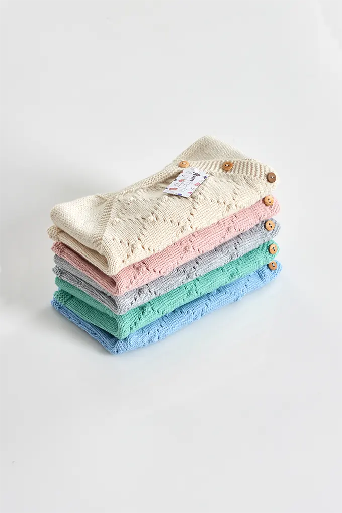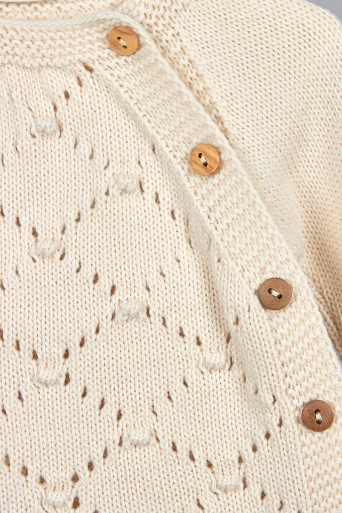 Conjunto de bebé em malha macia, composto por três peças: camisola com fecho trespasse e trabalhado delicado, collants e touca a condizer. Um modelo prático e encantador, ideal para os primeiros meses do bebé.