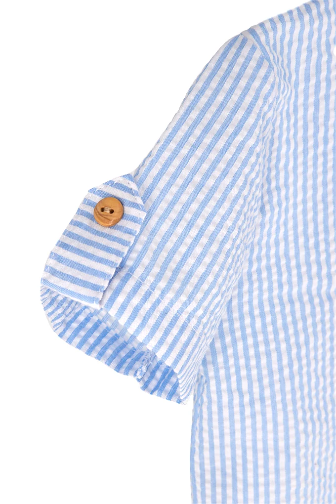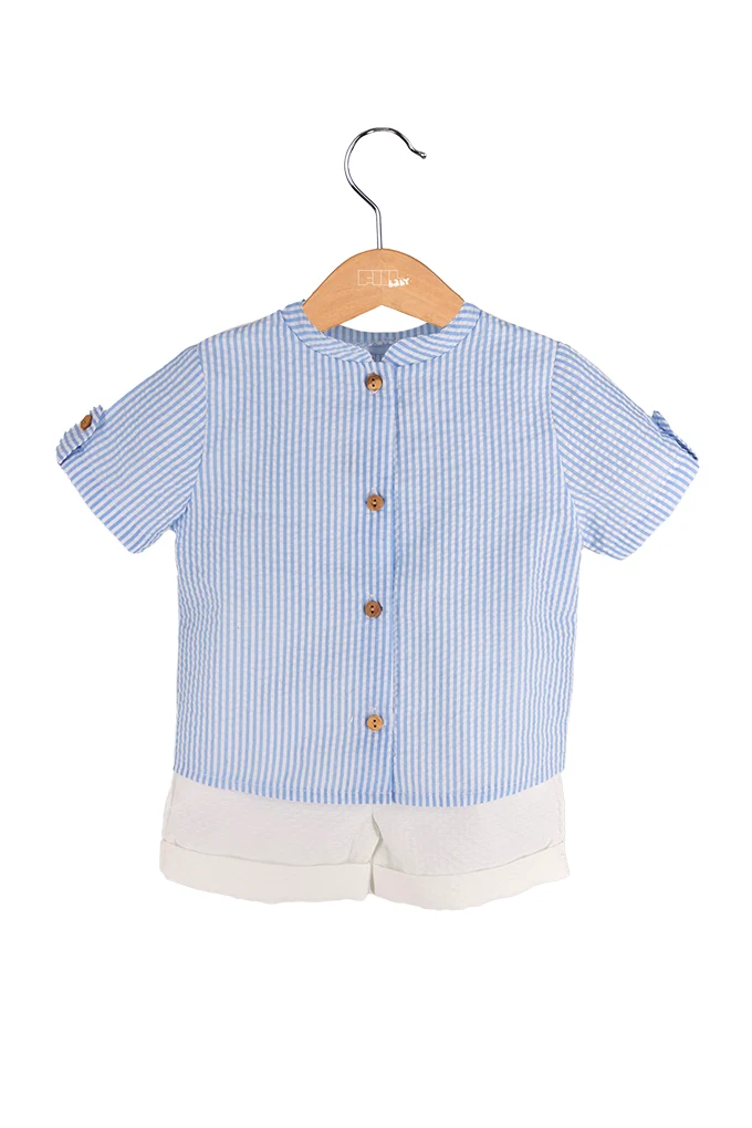 Conjunto de bebé em tecido de algodão, composto por blusa de manga curta com riscas finas e fecho de botões à frente. Inclui calções brancos em piquet. Uma opção leve, elegante e fresca para os dias mais quentes.