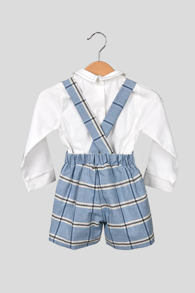 Fofo de bebé em tecido de estampado aos quadrados, com alças cruzadas nas costas e cintura elástica. Acompanha blusa de manga comprida com gola em piquet e abertura traseira com botões.
