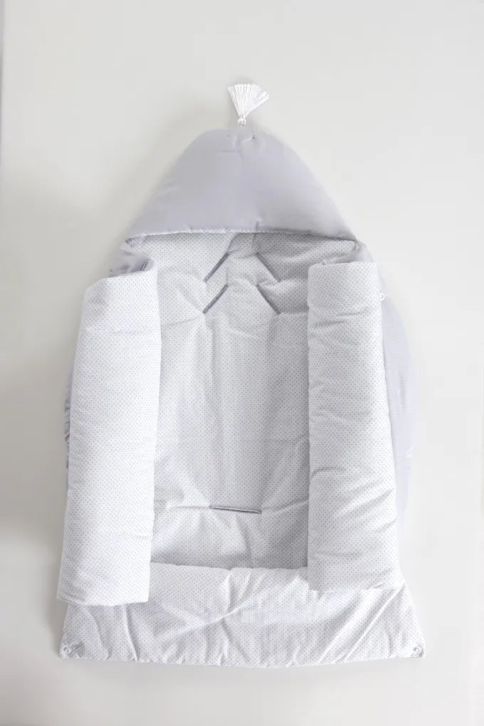 Ninho de bebé com 3 aplicações: saco de dormir, capa de carrinho e muda-fraldas.