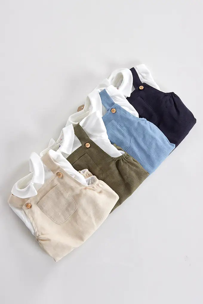 Conjunto de bebé composto por camisa de manga curta e jardineira em linho suave. A jardineira, com abertura de botões entrepernas, combina conforto e estilo num modelo prático para o dia a dia.