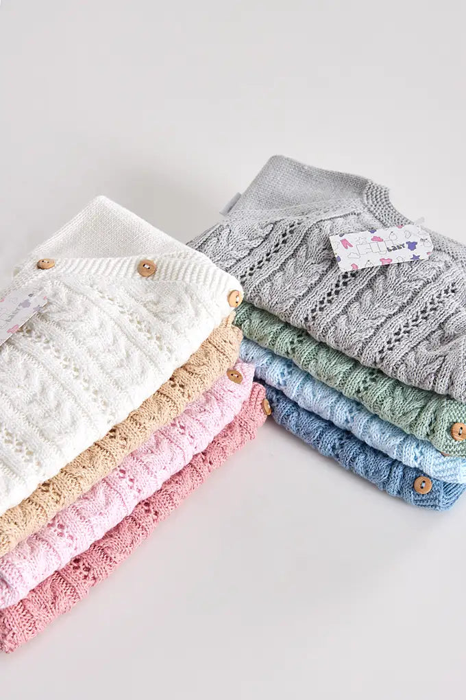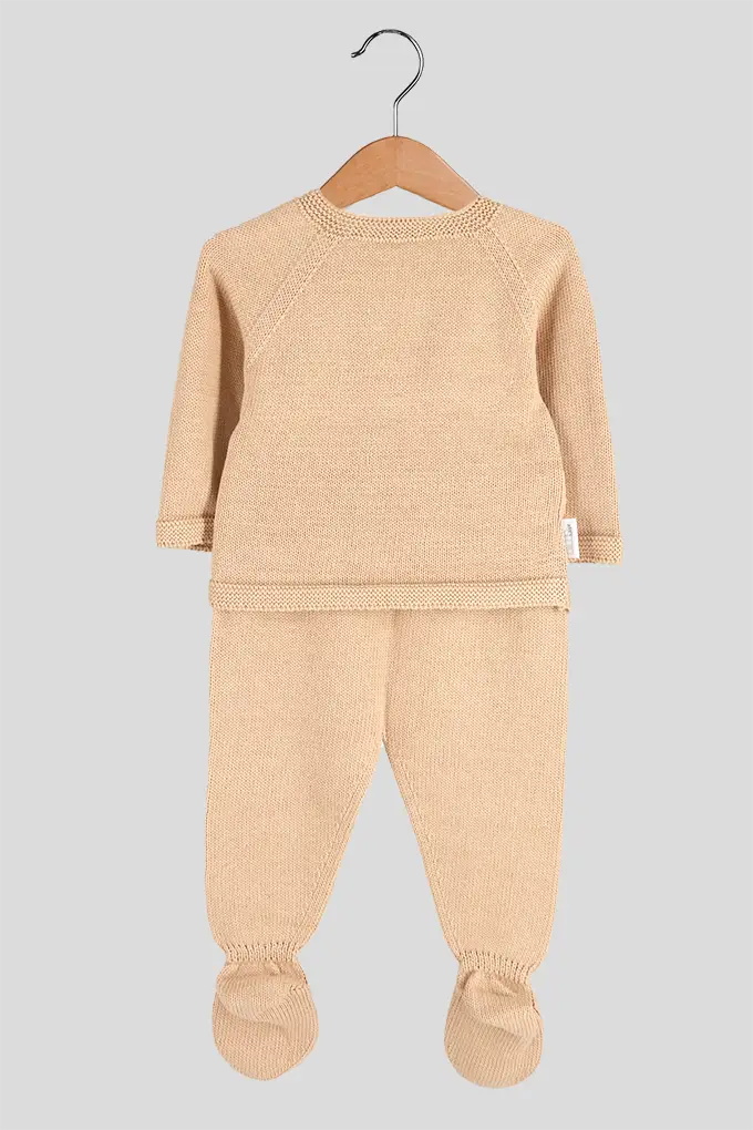 Conjunto de bebé em malha de algodão lavado, composto por camisola com fecho traseiro e calças com pezinhos. Um essencial prático e confortável para os dias frescos, pensado para envolver o bebé com suavidade e liberdade de movimento.