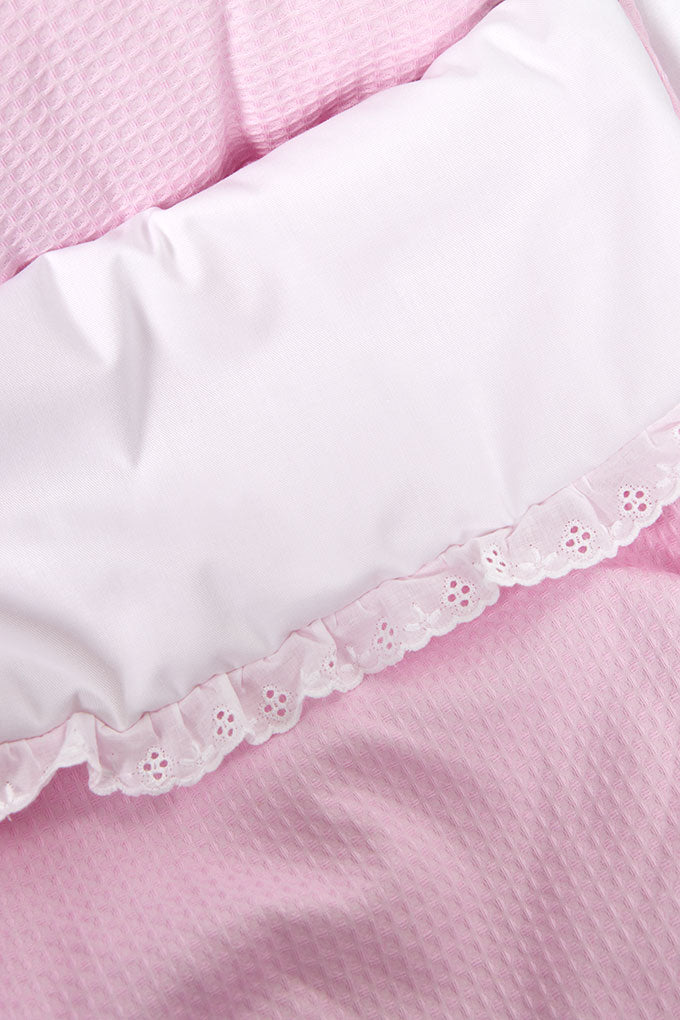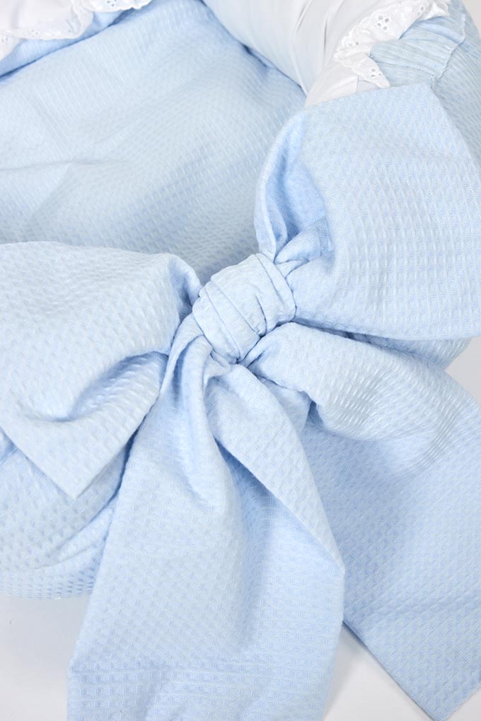 Ninhos com aplicações waffle, laterais acolchoadas, incluindo uma almofada e manta.