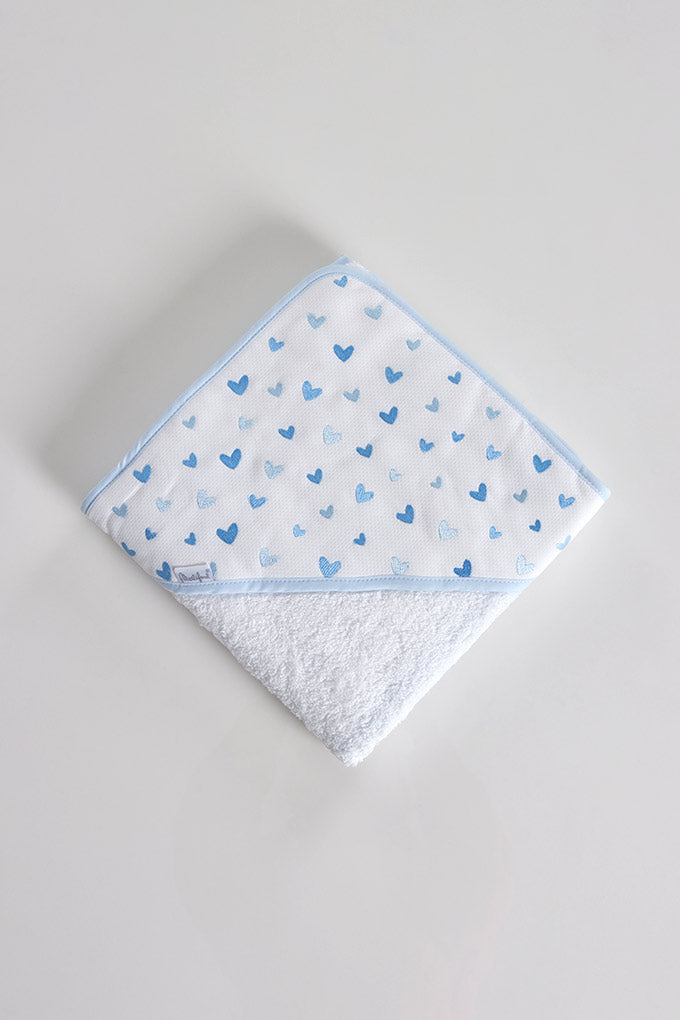 Toalha de bebé em tecido de algodão, com capuz em piquet decorado com delicados corações bordados. Suave, absorvente e perfeita para envolver o bebé após o banho.