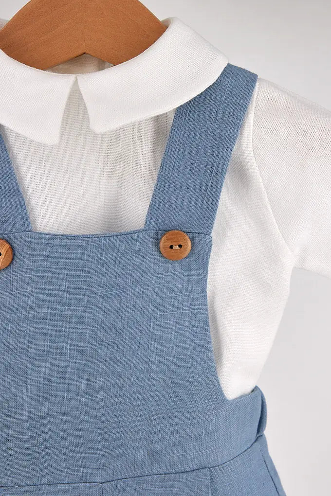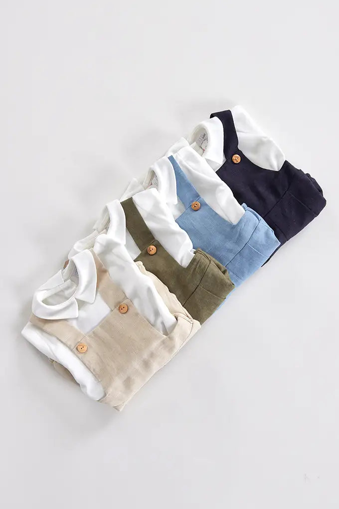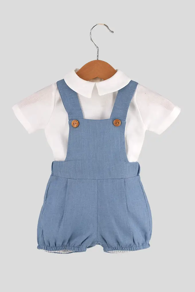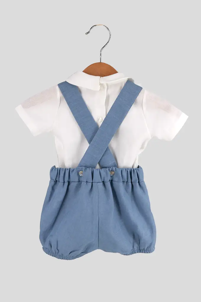 Conjunto de bebé composto por camisa de manga curta em algodão leve e fofo em linho com alças cruzadas. Um modelo clássico e fresco, ideal para os dias de verão. Abertura com botões para facilitar a troca e o conforto do bebé.