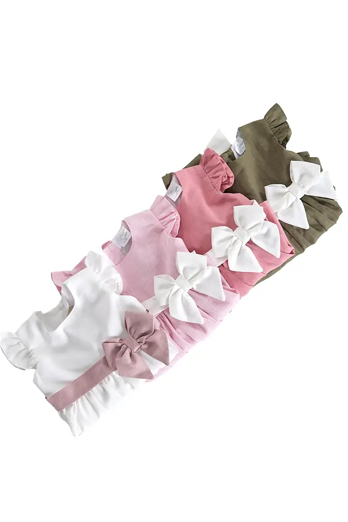 Túnica de bebé com tapa-fraldas e aplicação de laço.